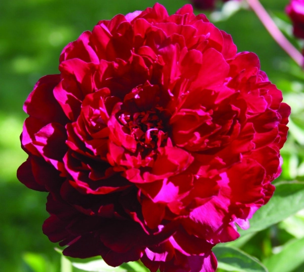 Травянистый пион, с симметрично закрытым центром. Цветок тёмно-красного цвета, с тёмным отблеском.
