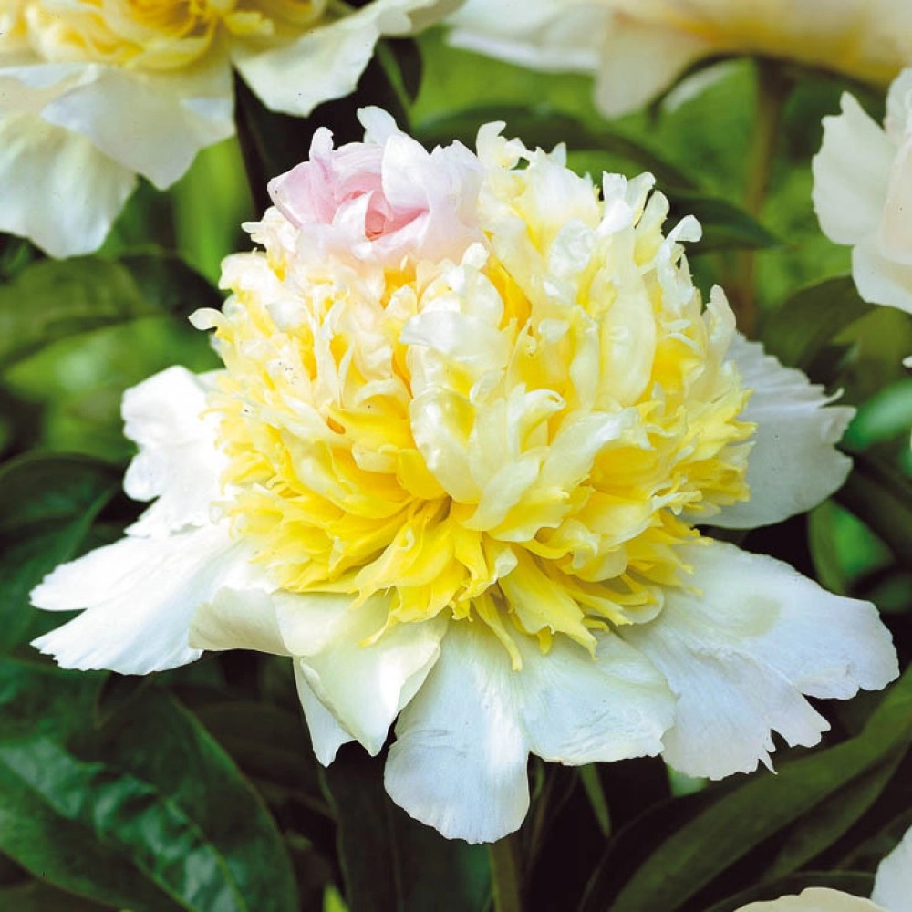 В высоту куст достигает 90-110 см, в ширину —100-120 см.Листья крупные, гладкие, темно-зеленые, дважды-перистые с глянцевым блеском.Предпочитает солнечные открытые участки или легкую полутень.Цветы махровые, в форме шара, окаймленного двумя ярусами белых лепестков. В центре, среди ярко желтых стаминодий, сформированы розовые лепестки, образующие хохолок. Цветет во второй половине июня, долго не осыпается.
