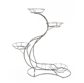 Напольная подставка для цветов Конек на 4 горшка М0000055 сделана из прочного стального прутка диаметром 8мм, окрашенного порошковой краской в цвет «античное золото». Изделие состоит из 2 корзинок (нижнее кольцо корзинки 14,5см, верхнее кольцо корзинки 22см, высота корзинки 3,5см) и 2 корзинок (нижнее кольцо корзинки 16,5см, верхнее кольцо корзинки 24см, высота корзинки 3,5см), расположенных на разных уровнях, что позволяет создавать удивительные цветочные композиции. Оригинальная асимметричная форма подставки позволяет Вам разместить на ней лейку для полива цветов, а легкий вес (3,2кг), делает ее очень транспортабельной.