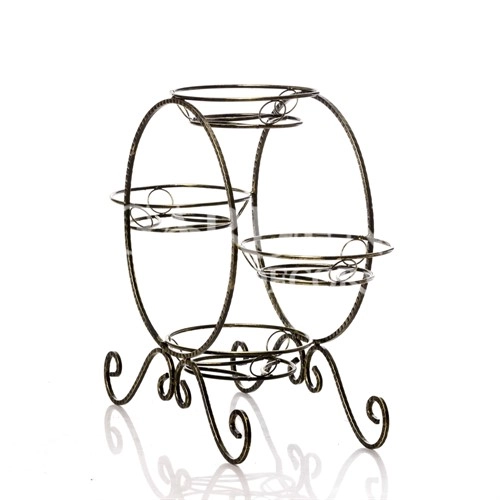 Подставка 70-004 предназначена для размещения четырех цветков на разных уровнях, но в одной плоскости, что позволяет установить подставку у стены или в нише и сделать ее интересным самостоятельным элементом в оформлении интерьера. Подставка выполнена из металлического резного и гладкого прутка черного с золотом цвета, корзинки декорированы кольцами.