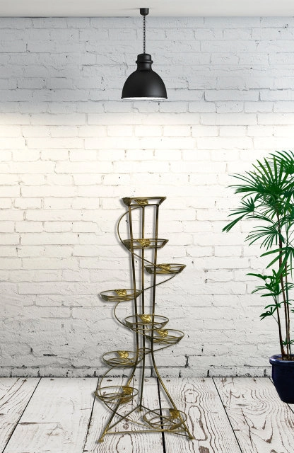 Металлическая настольная подставка для 9 цветков. Цвета: золото. Диаметр корзины 12см. Высота 88см, ширина у основания 34см. Комплектуется демпферами (специальные войлочные накладки на пятки стойки). Производство Россия.