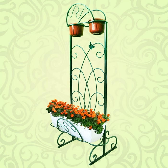 Предназначена для размещения пяти цветочных кашпо, три из которых располагаются снизу, а два – в верхней части. Представляет собой изысканную конструкцию в форме арки, изготовленную из металла зеленого цвета. Арка подставки декорирована переплетающимися друг с другом завитками, которые образуют чудесный узор. Бабочка, расположившаяся на одном из завитков, «оживляет» подставку, придаёт ощущение легкости и воздушности.