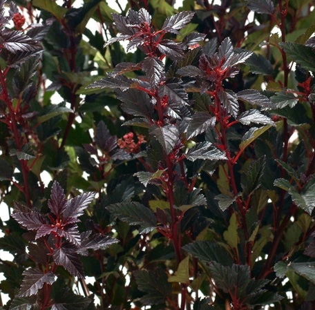 Невысокий кустарник высотой до 1 метра. Листья- бордово- пурпурные, к осени- темные пурпурно-коричневые. Cтебли- коричнево-красные.Цветки мелкие розовато-белые, собраны в плотные щитковидные соцветия, появляются в начале июня.