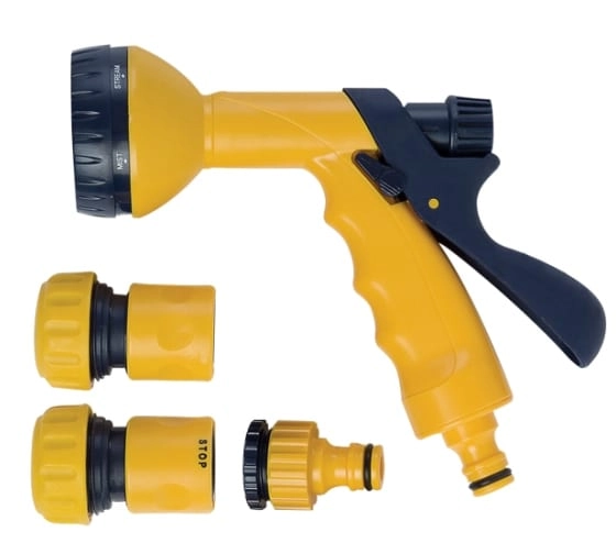 Включает многофункциональный распылитель, универсальный (G1/2 и G3/4) резьбовой штуцер, коннектор с автостопом на 19mm (3/4 шланг) и стандартный коннектор на 19mm (3/4 шланг). Многофункциональный распылитель: 6 режимов полива. Плавно регулируемое распыление. Курок с фиксатором.