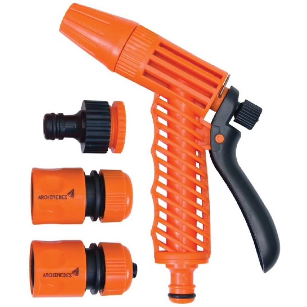 Расширенный набор с регулируемым пистолетом-наконечником Archimedes 90932 выполнен из качественного материала и имеет длительный срок службы. Используется для полива растений. Состоит из четырех предметов: пистолета-наконечника, резьбового штуцера и двух коннекторов для шлангов 1/2". Функция автостоп обеспечивает защиту от вытекания воды.