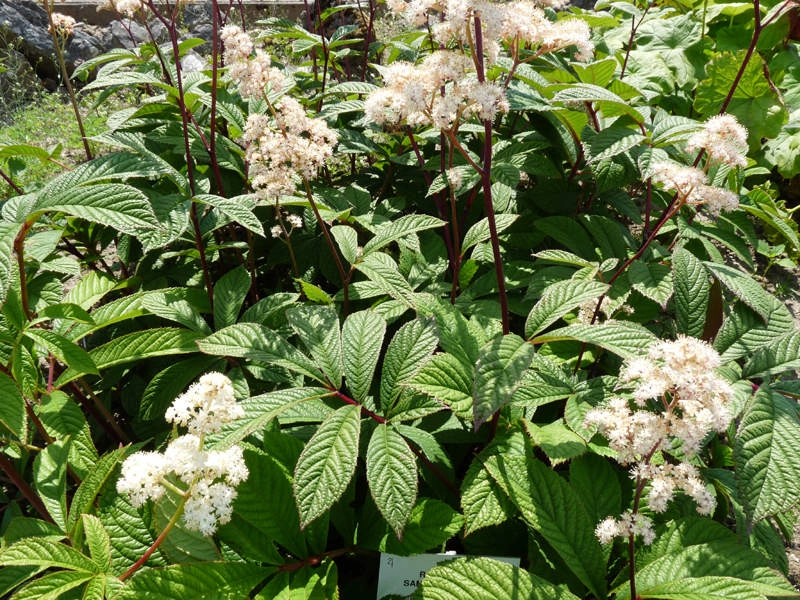 Высота растений во время цветения 120 см, до и после него – 70 см. Листья перисторассеченные, по форме напоминают листья бузины – они зеленые с бронзовым отливом. Соцветия – некрупные кремово-белые, душистые метелки. Цветение в июле.