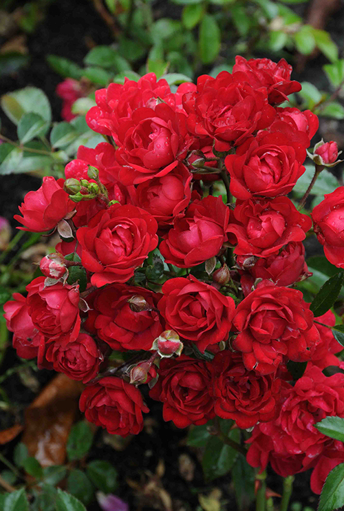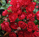 Цветки махровые, темно-красные, маленькие, до 3 см в диаметре, собраны в большие кисти, без аромата.