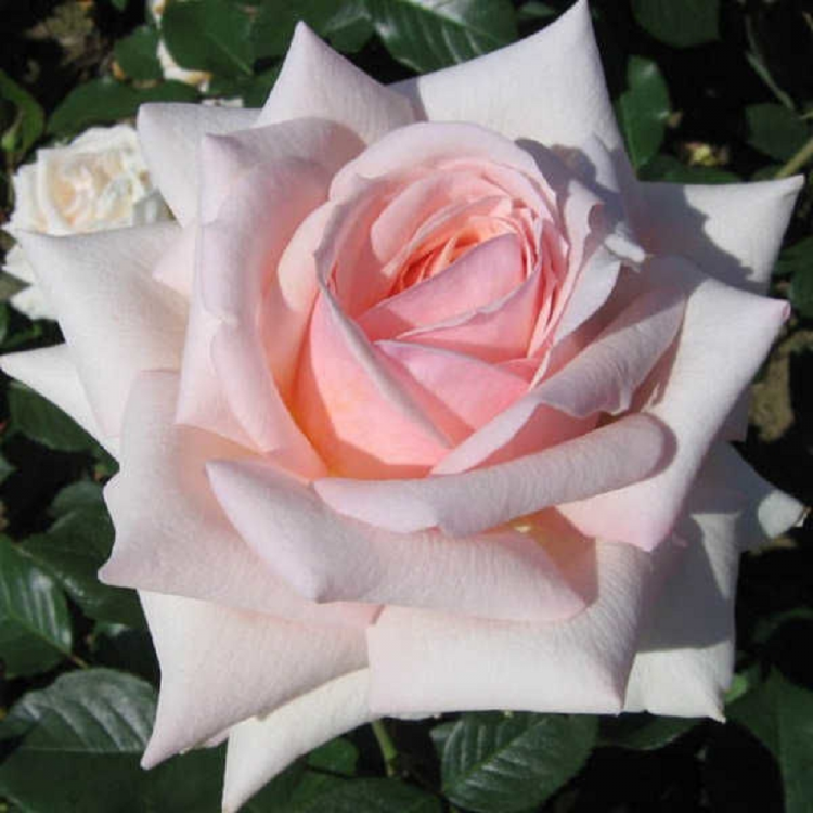Цветок нежно-розовый, плотный бутон открывается постепенно, в полном роспуске светло-розовые крайние лепестки как бы обрамляют более тёмную серединку и складываются уголком. Серединку не показывает. Цветы крупные, с лёгким ароматом, хорошо переносят дождь и солнце. Куст компактный, с темно-зелёной, глянцевой листвой. Высота: 60 – 70 см. Диаметр кроны: 60 см.