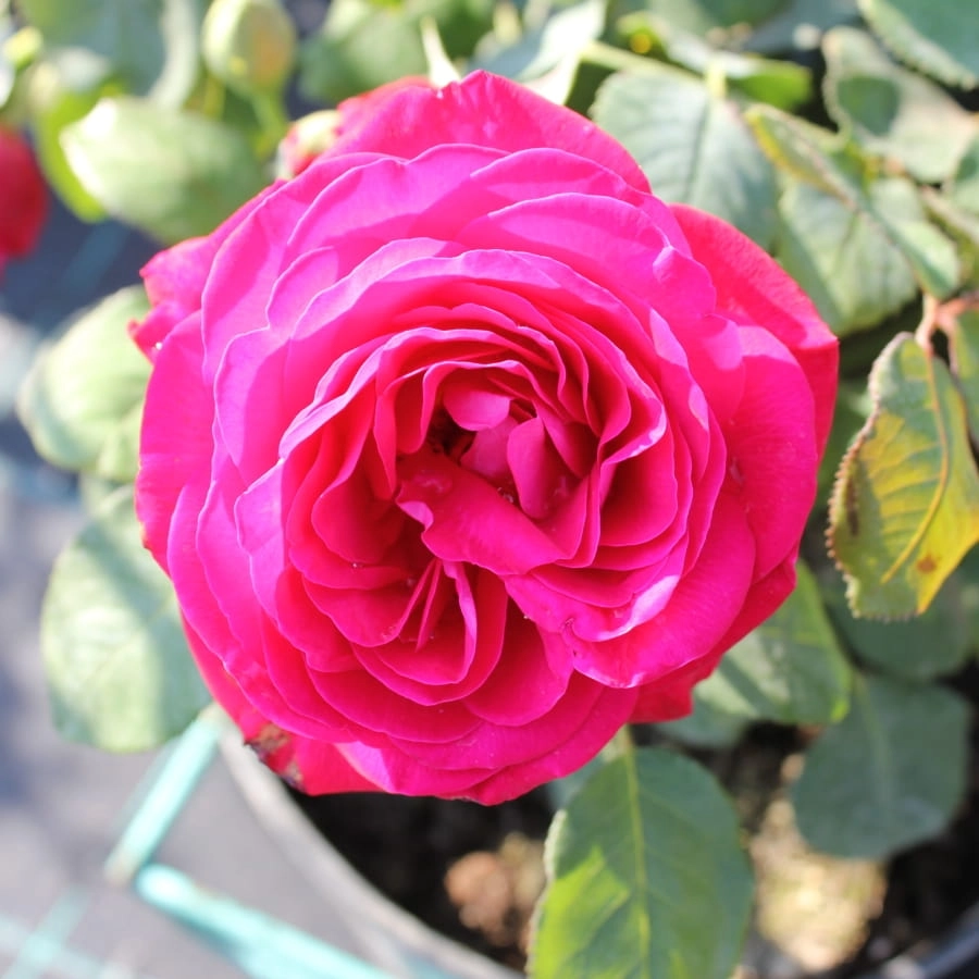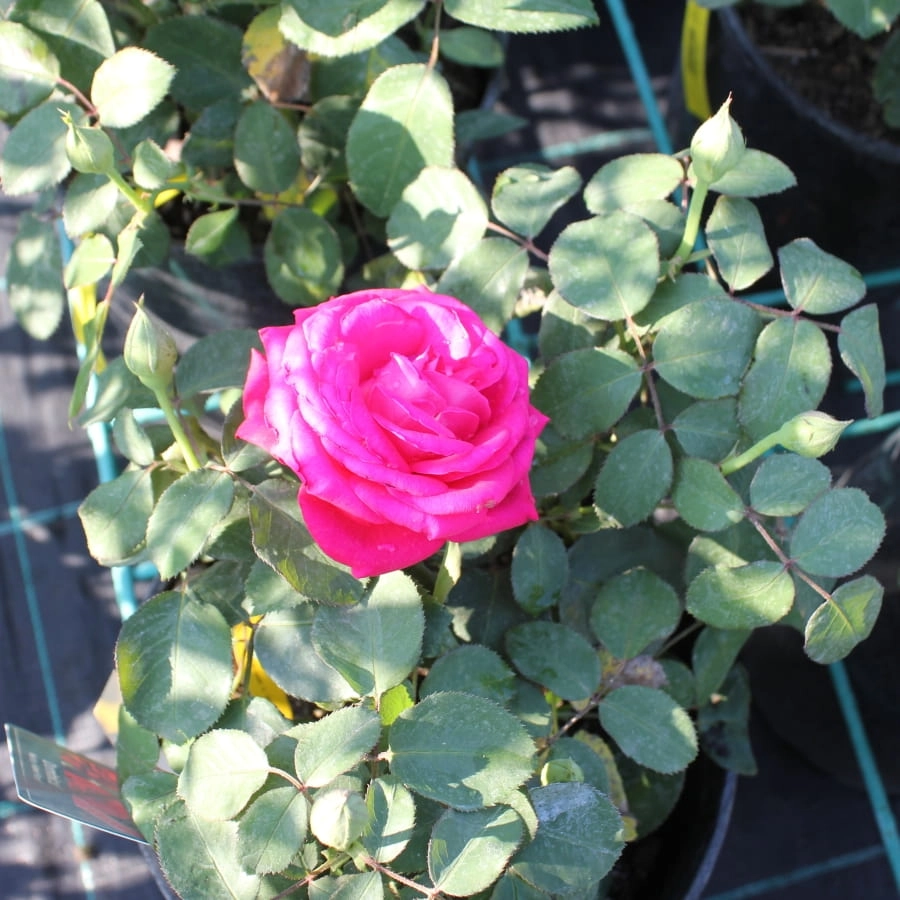 Цветки диаметром 10-12 см, махровые (30 лепестков), красные, в соцветиях. Аромат чайной розы. Цветение обильное, повторное, до заморозков. Листва кожистая, тёмно-зелёная, глянцевая, очень устойчивая к заболеваниям. Куст компактный, хорошо сформированный, высотой 70 см.