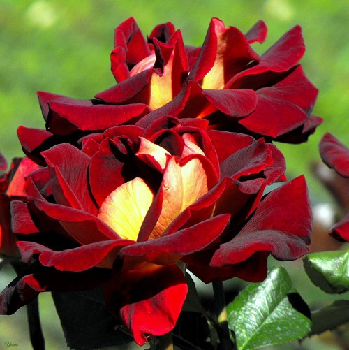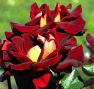 Цветки бархатисто-красные, позднее почти черные, с золотисто-желтой изнанкой. Аромат легкий или отсутствует. Цветки бокаловидные, около 10 см в диаметре, из около 30 лепестков, появляются обычно по одному.