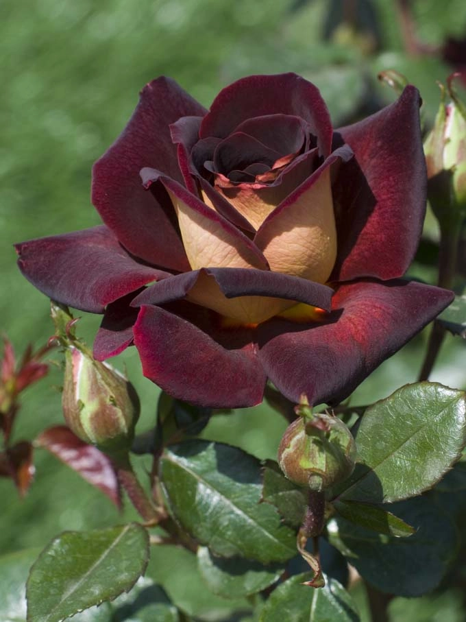 Чайно-гибридные розы. Высота 50 - 100 см. Цветок бархатный бордово-красный, обратная сторона лепестков золотисто-кремовая, махровый, диаметр цветка 10 см, обладает легким ароматом. Цветение обильное, непрерывное с июня по сентябрь.