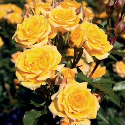 Патио розы (миниатюрные). Высота 40-50 см. Цветки диаметром 5 см, ярко-желтые, густомахровые, в больших зонтиковидных соцветиях. Кусты пряморослые, пышные, побеги быстро отрастают. Отлично подходит для выращивания в контейнерах.