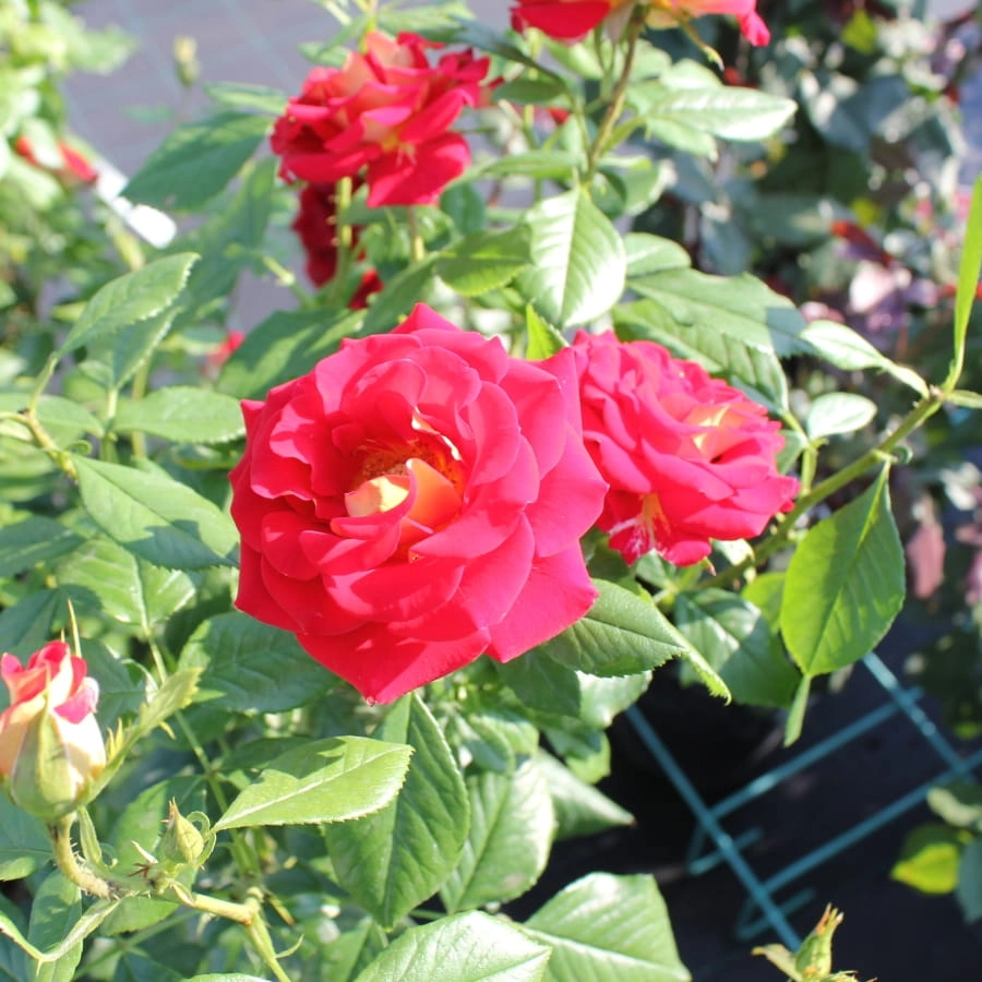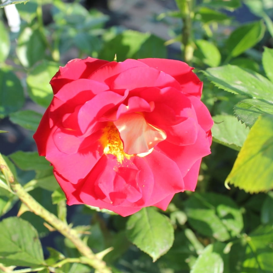 | Цветок | Ярко-красные цветки с темно-желтым реверсом, умеренно-махровые (20-28 лепестков), в полу-роспуске классической формы, затем - свободной чашевидной, на побегах одиночные, диаметром 8-10 см. Аромат чая и яблока. |