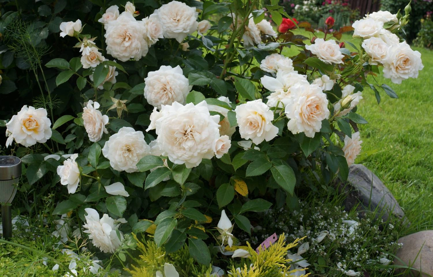 | Цветок | Цветки полумахровые, чисто-белые с золотисто-жёлтыми тычинками. Кусты очень мощные, обильно цветущие, по 5-10 шт., на цветоносе. Цветки с самого начала цветения и до конца сезона сохраняют и форму, и окрас, и аромат. |