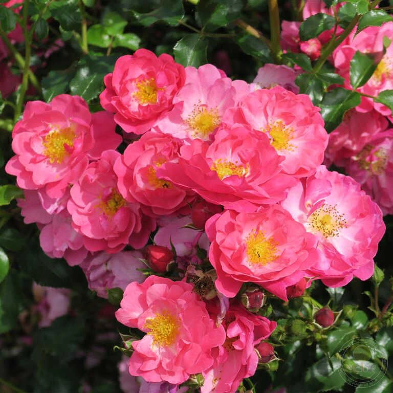 Относится к группе почвопокровные. Куст раскидистый, формируется легко, высота 0,5 м. Цветки ярко-розовые, 5 см, лепестки волнистые, форма соцветия полумахровая, классическая, чашевидная, цветение кистями и одиночное, повторноцветущая, присутствует приятный легкий аромат.