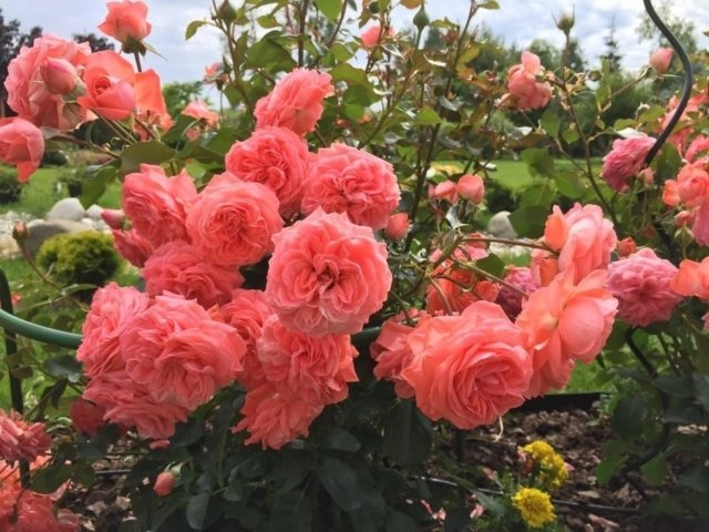 Роза плетистая Клайминг Кимоно (Climbing Kimono). Цветки лососево-розовые, крупные, без аромата. Куст высотой до 4м. Цветет на протяжении всего сезона.
