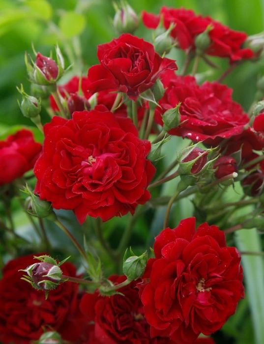 Kordes. Cортосерия 'Siluetta'. Цветки диаметром 3-4 см, махровые, карминно-красные, в больших зонтиковидных соцветиях. Цветение повторное. Листва высокоустойчивая к чёрной пятнистости и мучнистой росе. Побеги гибкие. Розы сортосерии 'Siluetta' подходят для небольших садов и живых изгородей.