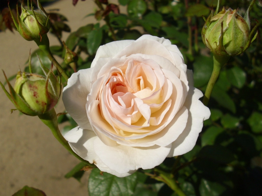 Округлые бутоны окрашены в ту же палитру, что и цветки. В полураскрытии густомахровый (60-75 лепестков) цветок имеет кремовую окраску, в полном раскрытии проявляются абрикосовые оттенки. Размер цветка 7-9 и до 13 см, расположение на стебле — в соцветиях от 3 до 5 бутонов. Флорибунда издает сладковатый, нежный и приятный аромат, не слишком интенсивный, но усиливающийся во время дождя.Первая волна цветения приходится на 1 декаду июня, следующая на середину августа, промежуток между ними довольно краток.