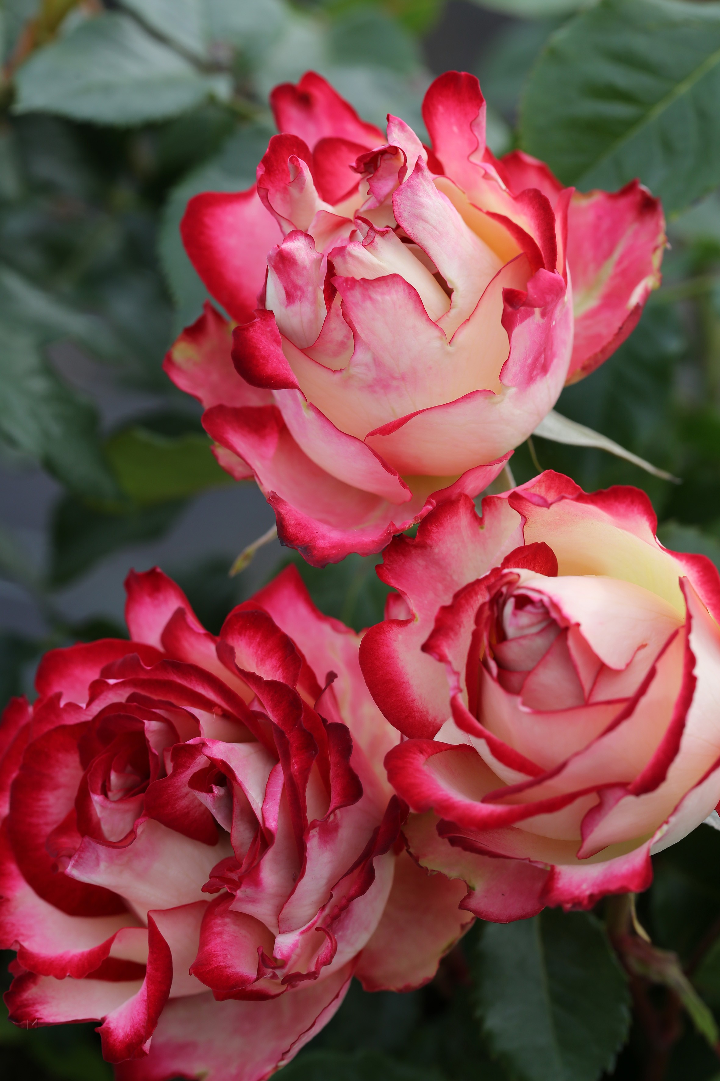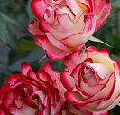 Двуцветная роза лепестки цветков белые с вишнево-красными краями.