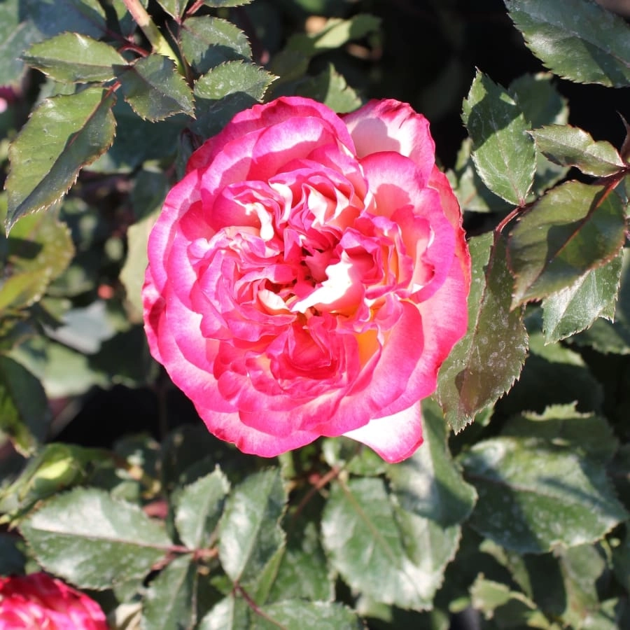 Крупные (10-12 см) белые цветы с вишнево-красными краями впечатляют. Держатся до 14 дней. Куст невысокий (60-80 см), компактный, прямостоячий, хорошо облиственный. Листья темно-зеленые, блестящие. Сорт устойчив к заболеваниям, морозостойкий (6 зона). Цветение волнами в течение сезона. Пригоден для выращивания в горшке, для переднего плана цветника. Неприхотливость и отличная зимостойкость — вот отличительные особенности этих роз.