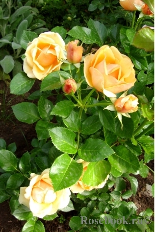 Флорибунда. Высота 40-60 см. Цветки огненно-оранжевые, открытые, средние, полумахровые, в соцветиях. Кусты очень сильные, густые, прямые.