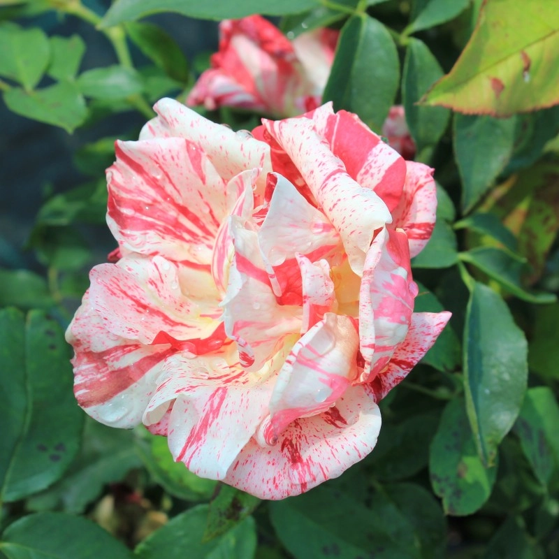 Бутоны классической формы раскрываются в крупные, малиново-красные цветки с белыми полосками.Диаметр цветков: 9-10 см. Высота куста: 80-100 см. Ширина куста: 50 см. Аромат: средний. Период цветения: повторноцветущая. Устойчивость к заболеваниям: черной пятнистости - средняя, мучнистой росе - средняя.