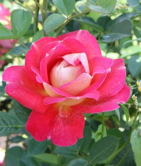 Высота куста около 3 м. диаметр цветка 9-11 см.Не имеет одинаковых цветков на кусте – имеют малиново-розовый, насыщенно-клубничный, желтый (от бледно желтого на наружной поверхности лепестка, до ярко-желтого в центре внутреннего) цвета. Цветки махровые. Высокая устойчивость к болезням и морозам, к дождям и жаре. Обладает душистым ароматом. Цветение обильное и продоолжительное.