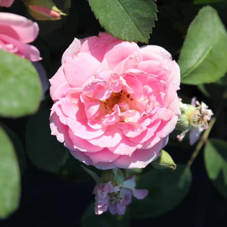 | Цветок | Канадский гибрид. Цветки довольно крупные, густомахровые, в старинном стиле, с пуговкой в центре, насыщенно-розовые, выгорают до нежно-розовых. Появляются по одному или в кистях до 6 шт., затем завязываются мелкие оранжевые плоды. |