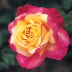 Чайно-гибридные розы. Высота 50 - 100 см. Цветок ярко-желтый с малиновой каймой, махровый, диаметр цветка 13 - 14 см, обладает насыщенным фруктовым ароматом чайной розы. Цветение обильное, непрерывное с июня по сентябрь.