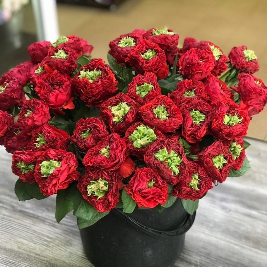 | Цветок | Махровая роза с алыми лепестками и насыщенной ярко-зеленой сердцевиной, 8-10 см. |
