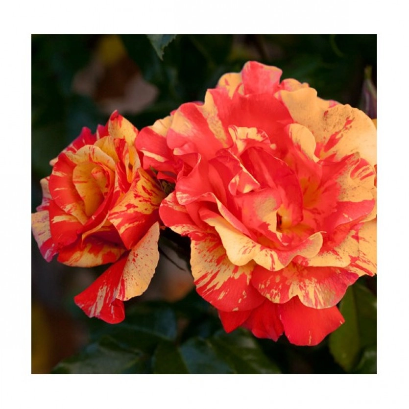 Цветок: красно-желтый пятнисто-полосатый, плоский до чашевидного, махровый, 35 - 40 лепестков в одном цветке, диаметр цветка 9 - 10 см, обладает фруктовым ароматом.