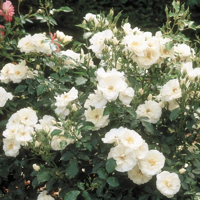 Цветки мелкие, полумахровые, чистого сияющего белого цвета, с легким ароматом. Цветет обильно и непрерывно небольшими кистями по всей поверхности растения до первых морозов. Цветки оттеняются мелкой темной аккуратной листвой, устойчивой к болезням. Куст низкий, раскидистый, высотой 60-75 см.