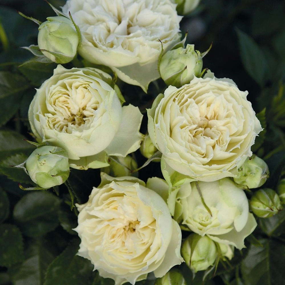 Группа: спрей. Окраска цветка: кремово-белый. Окраска бутона: . зеленоватого оттенка с малиновыми мазками. Размер цветка: средний. Тип цветка:густомахровый. Интенсивность аромата: средний, легкий малиновый. Высота куста, 100-120см, ширина куста, 45-60 см. Местоположение: любит солнечный свет, переносит полутень . Устойчивость к болезням и вредителям: высокая. Период цветения: с лета до осени. Повторноцветущая. Зона морозостойкости: 6 (от -23° до -18°).