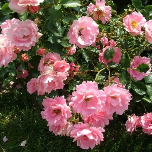 Розы Sommerwind, одного из выносливых почвопокровных сортов, можно приобрести в нашем питомнике по выгодной цене и с доставкой на дом. Куст формируется высотой 0,7 м и шириной 1,25 м. Гибкие побеги покрыты блестящей, мелкой листвой. Бутоны сформированы в соцветья по 5-25 штук. Изначально цветки насыщенно розовые с желтыми серединками. Потом лепестки выгорают до светло-розового окраса, а тычинки немного темнеют. Размер бутона – 5 см. Аромат – еле различимый. Крупномеры Sommerwind цветут обильно весь сезон. Куст не боится болезней и вредителей. Цветки проявляют среднюю устойчивость к дождю.
