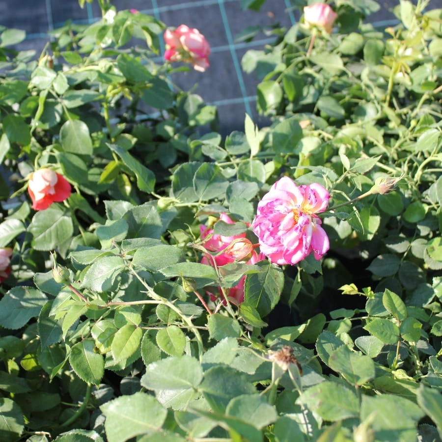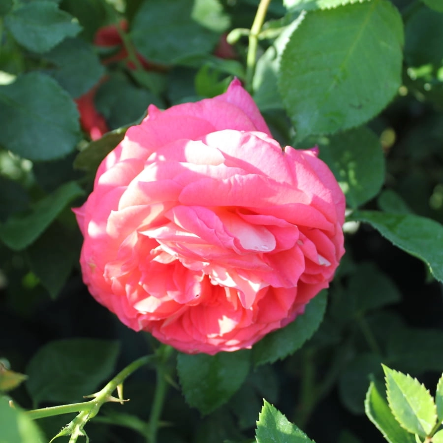 Роза Sommersonne (Зоммерзонне). Кораллово-красные бутоны раскрываются в чашевидные, махровые (50-60 лепестков) цветки со сливочно-желтой изнанкой. В полном роспуске может показать серединку. Цветки не повреждаются дождем.