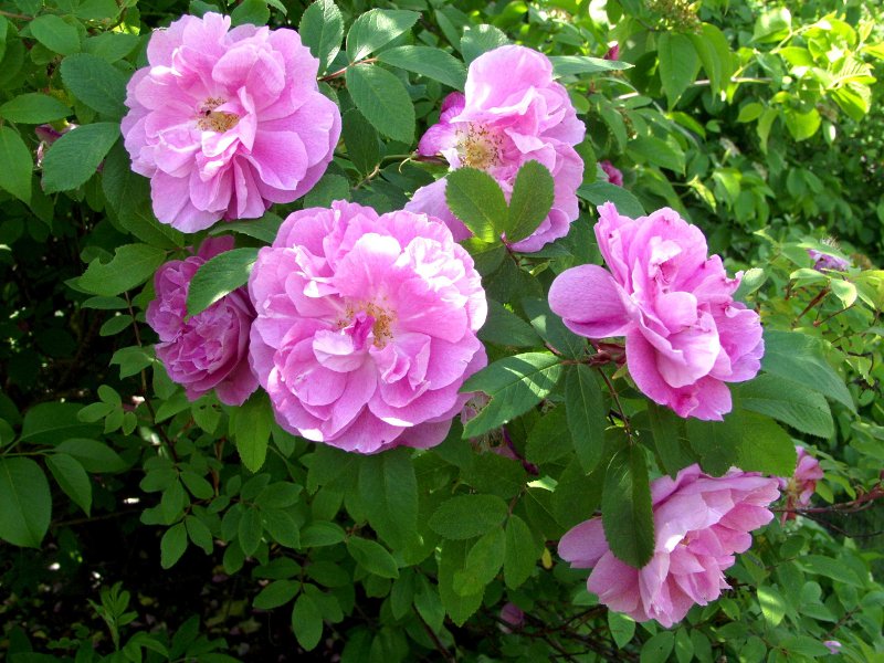 Цветки ярко-розовые, крупные, махровые, ароматные. Лепестки уложены в изящном беспорядке. Появляются в большом количестве, по одному или в кистях до 5 шт.
