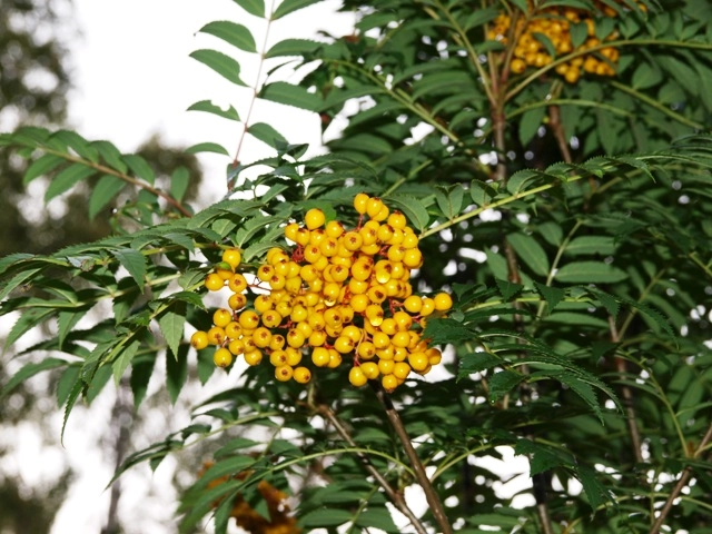 Цветки кремово-белые в крупных щитковидных соцветиях, цветет в мае. Плоды - многочисленные, шаровидные, желтые или оранжево-желтые с красным пятнышком на верхушке, созревают в конце августа-начале сентября.