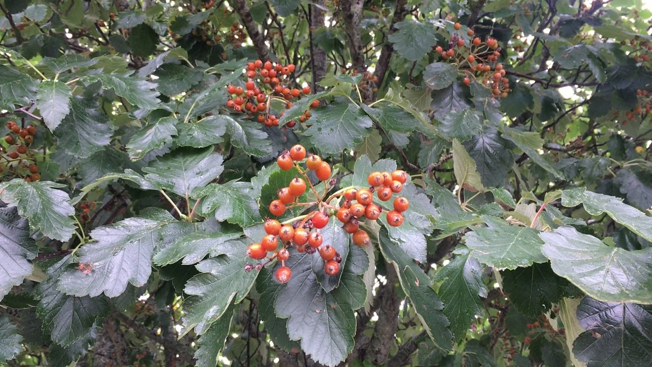 Листья цельные, продолговато-яйцевидные, среднелопастные, до 12 см длиной, тёмно-зелёные сверху, снизу сероватые из-за опушения. Осенью оранжево-красные.
