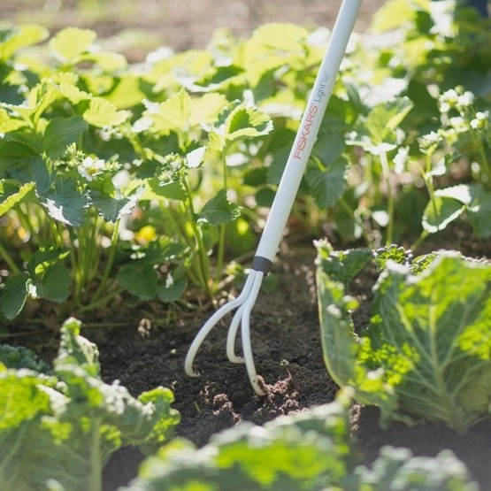 Легкий культиватор для разрыхления почвы на грядках или между растениями. Острые зубья из закаленной стали легко проникают в почву. Алюминиевый черенок овального сечения очень легкий, не подвержен коррозии. Пластиковое покрытие на черенке для удобного захвата. Петля на рукоятке для удобного хранения.