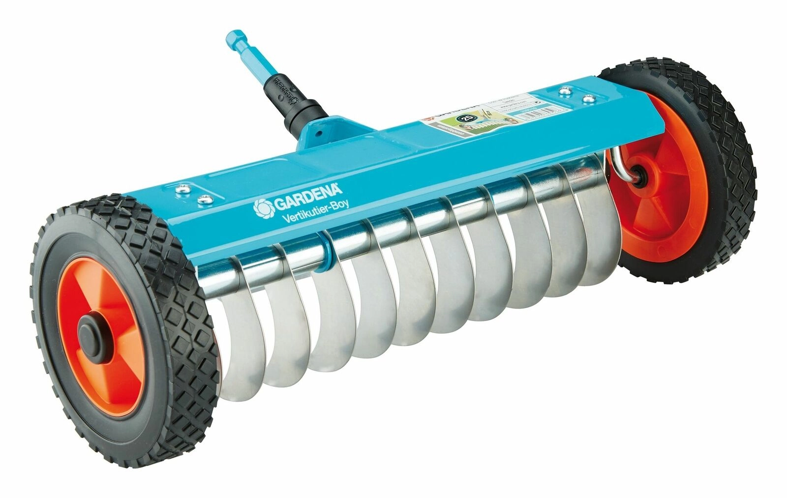 Зубья изделия имеют специальную форму, торец - гладкий, материал - пружинная сталь. Рабочая ширина - 32 см.Колеса со специальным протектором также играют роль вспомогательной опоры.Возможно применение совместно с любой ручкой комбисистемы GARDENA в зависимости от роста пользователя.