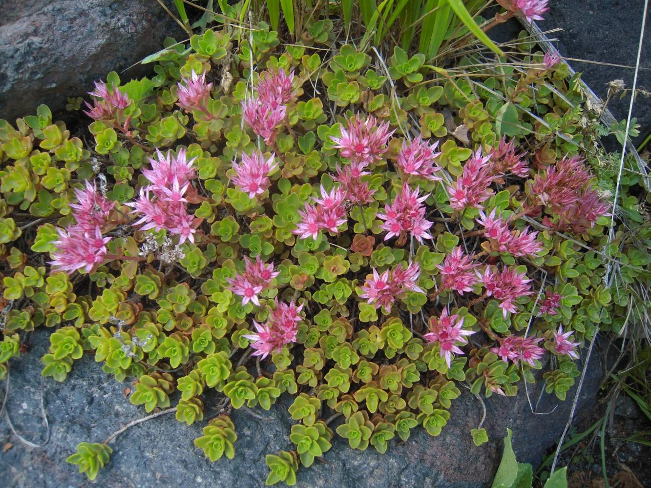Стебли седума ложного, в зависимости от видовой разновидности, могут быть стелющимися и приподнимающимися. Вегетативные или бесплодные побеги короче на 3 – 6 см фертильных, на которых созревают плоды. Темно-зелёные листья расположены супротивно, длина листовой пластины 1-2,5 см, ширина – 0,5-1 см. Клиновидной формы листочки слегка опушённые. Соцветия похожи на растопыренные зонтики, которые располагаются между извилистых ветвей. Соцветия не покрыты верхними листьями, как у других очитков. Небольшие розетки состоят из множества мелких розовых, белых или пурпурных цветков (в зависимости от сорта). Цветение начинается в июне и заканчивается в августе, длится в течение двух месяцев.