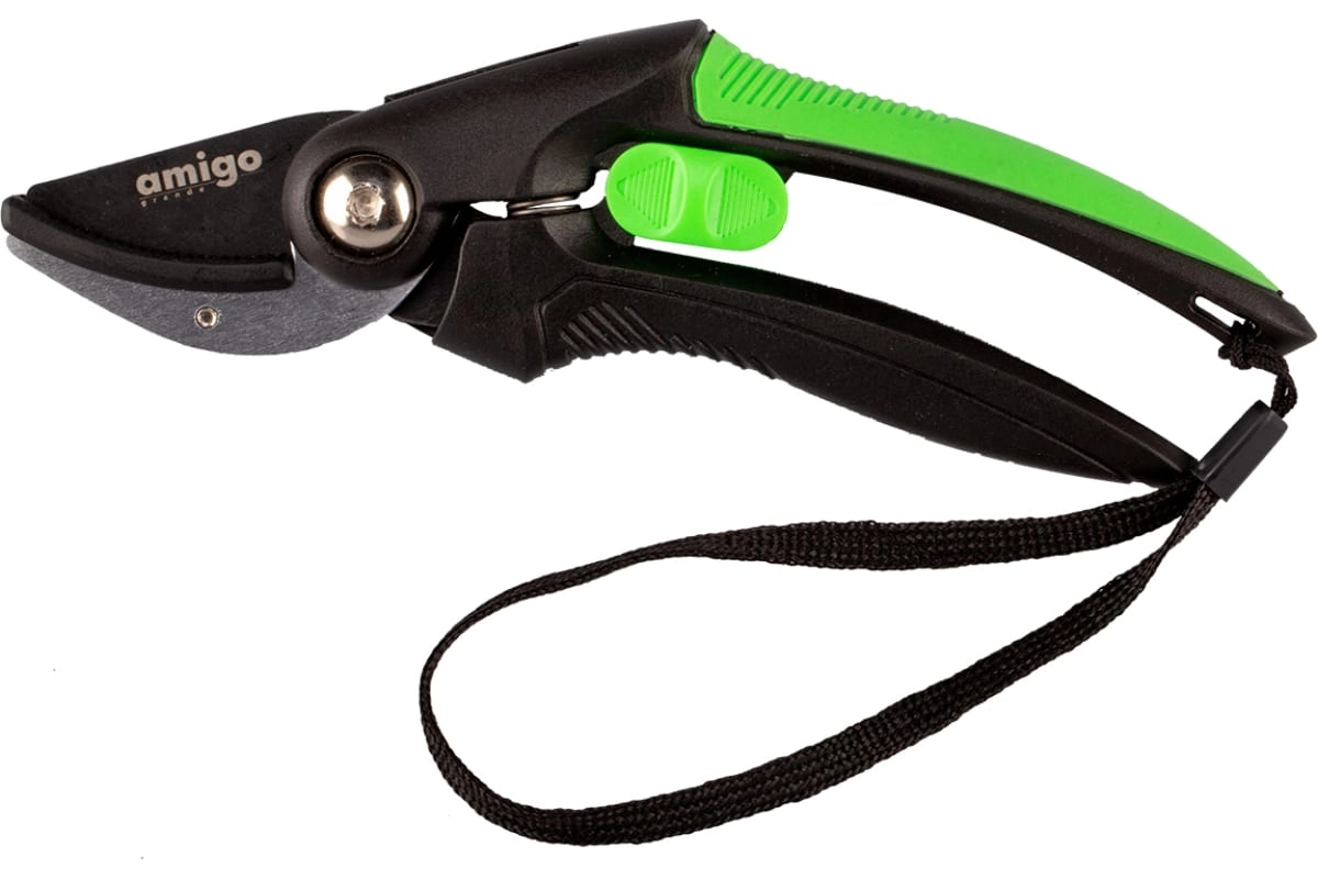Секатор AMIGO 76121 контактного типа подойдет для обрезки различных веток: и сухих, и живых диаметром до 20 мм. Нижнее лезвие заменено упором-«наковаленкой», который распределяет нагрузку реза. Сталь лезвий SK-5 долго сохраняет режущие свойства. Лезвия защищены антикоррозийным покрытием, это сбережет их от сока растений. Амортизирующий упор дает пружинящий эффект при смыкании рукояток.