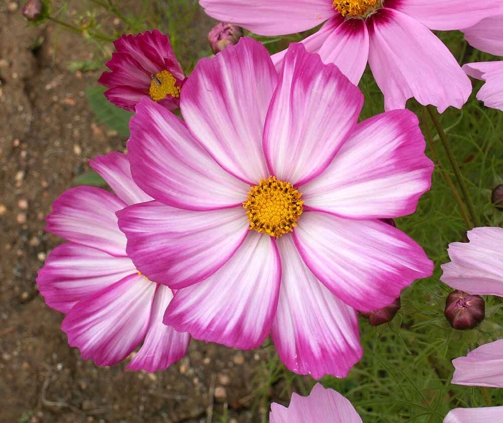 Космея Карусель - очень эффектный цветок, способный украсить любую клумбу. Цветы отлично подходят для срезки и составления красочных букетов. Листья ажурные, сильнорассеченные. Цветы собраны в соцветия-корзинки. Цвет - белый, имеется ярко-розовая каемка. Диаметр цветов составляет около 7-10 см. Высота растения - около 100 см. Космея цветет с июня по сентябрь. Соцветия белого, розового и бордового цвета. Семена заделываются непосредственно в грунт на глубину около 1 см. Однолетнее растение хорошо переносит низкие температуры, поэтому лучшее время для посадки конец апреля - май. Если температура установится 18 градусов, то семена взойдут уже через 8-14 дней. На рассаду семена проращиваются в марте. Схема посадки - 30х40 см. Для растения требуется хорошо освещенное место. Почва подойдет любая, но более пышные цветы получатся на рыхлой, плодородной почве. Космея хорошо уживается с другими цветами и может даже использоваться как притеняющее растение для цветов, не любящих солнце.