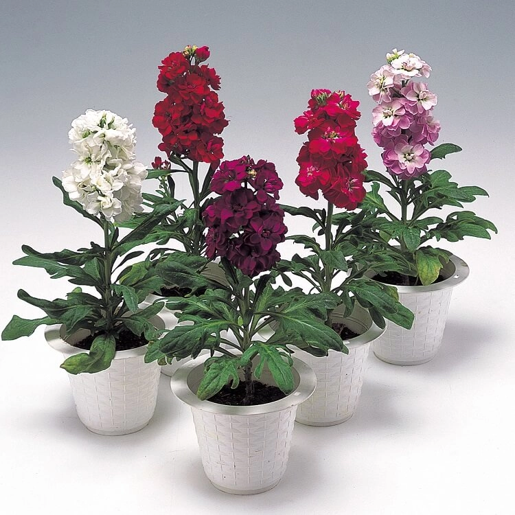 Смесь окрасок левкоя с высокими кустами и очень ароматными махровыми цветками. Широко используется на клумбах, в рабатках и цветниках, возле мест отдыха, подходит для выращивания в контейнерах. После срезки цветы стоят в воде до двух недель. Период цветения — с июня до заморозков. Высота растения — 60 см. Как сажать. Семена сеют непосредственно в грунт рано весной. Всходы прореживают. Можно посеять на рассаду в начале апреля, это ускорит цветение на 2 недели. Чтобы левкой цвёл дольше, сейте семена в несколько сроков с интервалом в 3 недели.