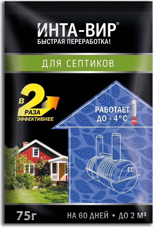 Средство для септиков Инта-Вир устраняет неприятные запахи, эффективно разлагает органические отходы, работает до 60 дней, безопасен для человека, животных и растений.