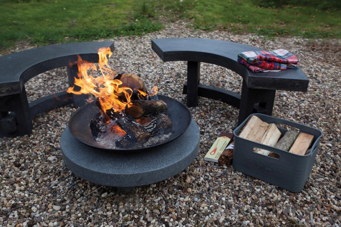 Скамья для костровой зоны Concretika. В единой стилистике с чашами и подставками производятся скамьи для костровых зон из фибробетона. Обычно вокруг костровой чаши устанавливают 3 скамьи, создавая завершенный круг.