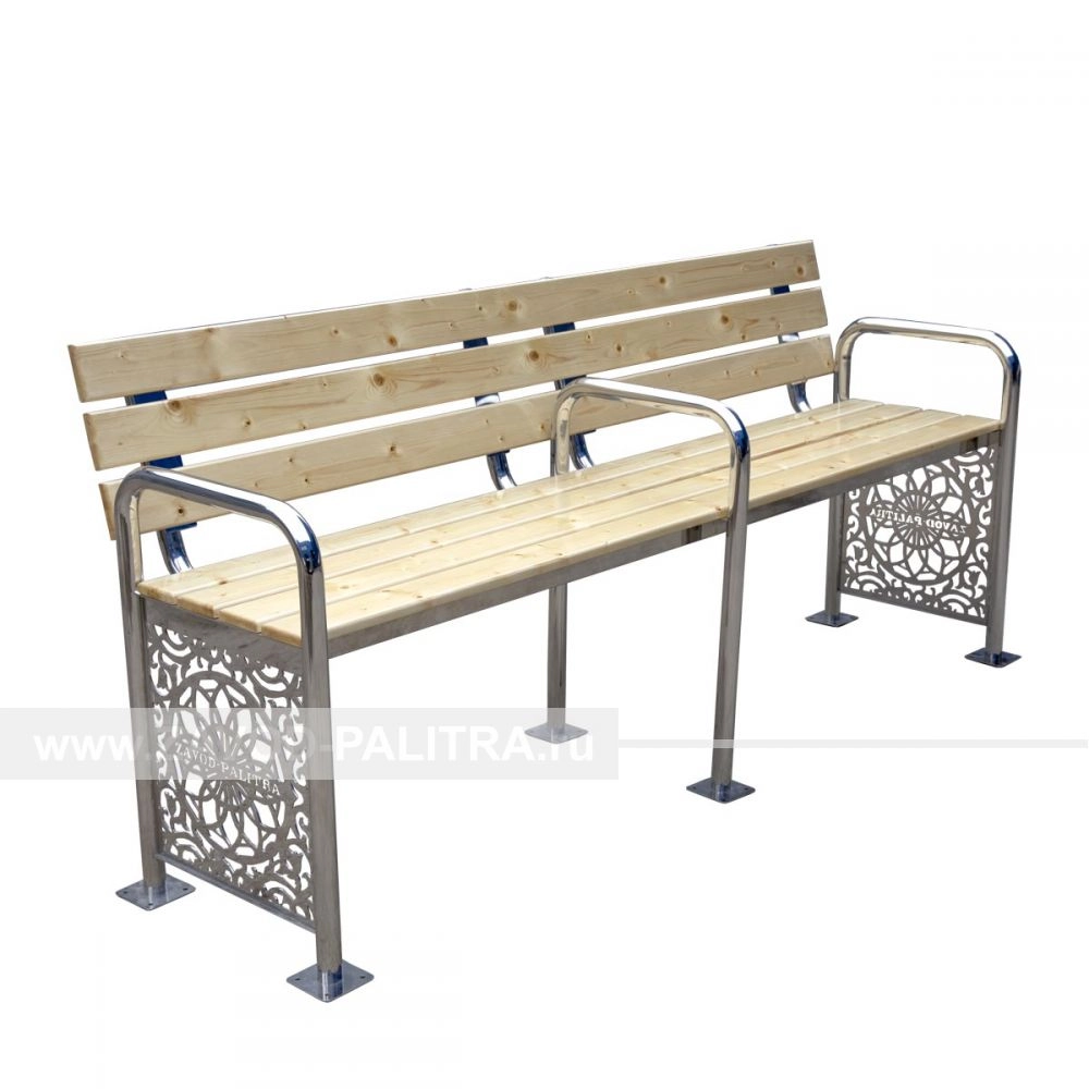 Скамья декоративная универсальная со спинкой предназначена для установки в садово-парковых зонах, для удобства людей с ограничениями в опорно-двигательном аппарате предусмотрены три высоких подлокотника. Скамья выполнена из нержавеющей стали с применением декоративной лазерной резки. Сидение выполнено из обработанного дерева: зашкуривание, покрытие морилкой и лаком. Основа скамьи может монтироваться к любой поверхности, даже к асфальту.