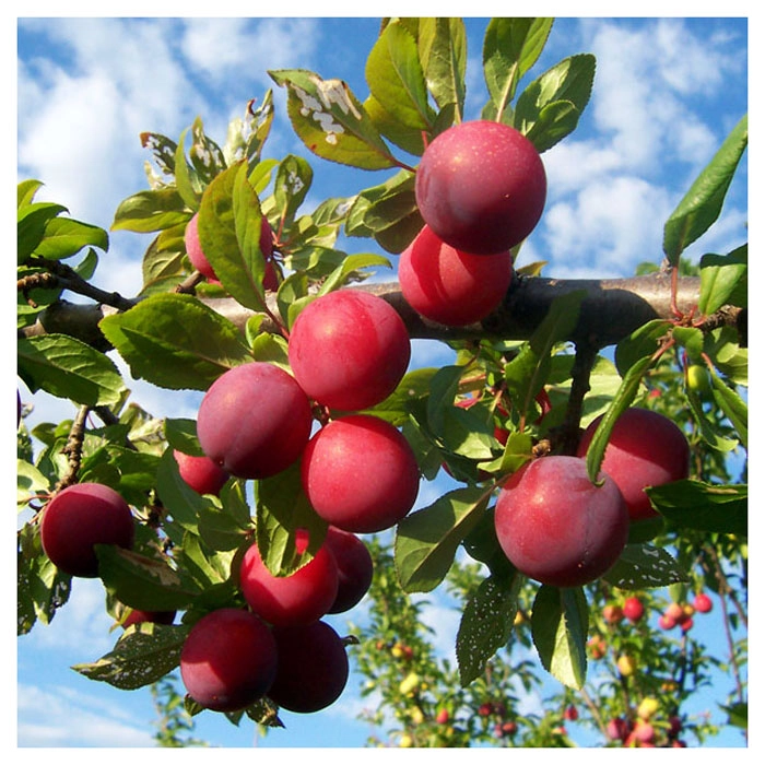 Дерево сильнорослое. Начинает плодоносить на 4 - 5 год жизни. Срок созревания конец августа - начало сентября. Сорт относится к ранним, крупноплодным – 50 гр. Ягоды по форме округлые, равнобокие. Покровный окрас плодов сплошной розово-красный с плотным восковым налетом, который покрывает весь плод. Кожица тонкая, но эластичная. Мякоть золотисто-жёлтого цвета, плотная, нежная и сочная. На воздухе темнеет слабо. Вкус сладкий, с лёгкой кислинкой. Сливы очень ароматные. Зимостойкость хорошая. Сорт частично самоплодный.