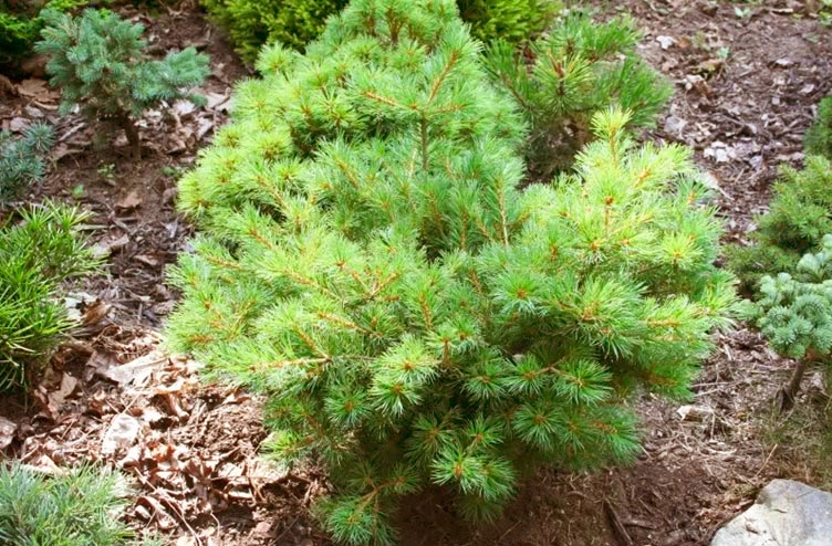 Сосна мелкоцветковая "Nellie D" - карликовый сорт. Годовой прирост 5-7 см. В 10 лет высота растения может достигать 50-60 см. Крона нерегулярная, плотная густая. Хвоя сине-зеленая, тонкая, длинная, слегка подкрученная собрана в пучки по 5 штук, В конце весны сосну украшают многочисленные красные шишки. морозостойкость — до -30°С; грунт — умеренно влажный, суглинистый или супесчаный, кислый, лёгкий; кислотность почвы — 4,5–6,5 pH. миксбордер, альпинарий, живая изгородь, солитер, топиар/бонсай, зимний акцент, для укрепление склона, береговая зона, вересковый сад, лесные посадки, группа/монопосадка.