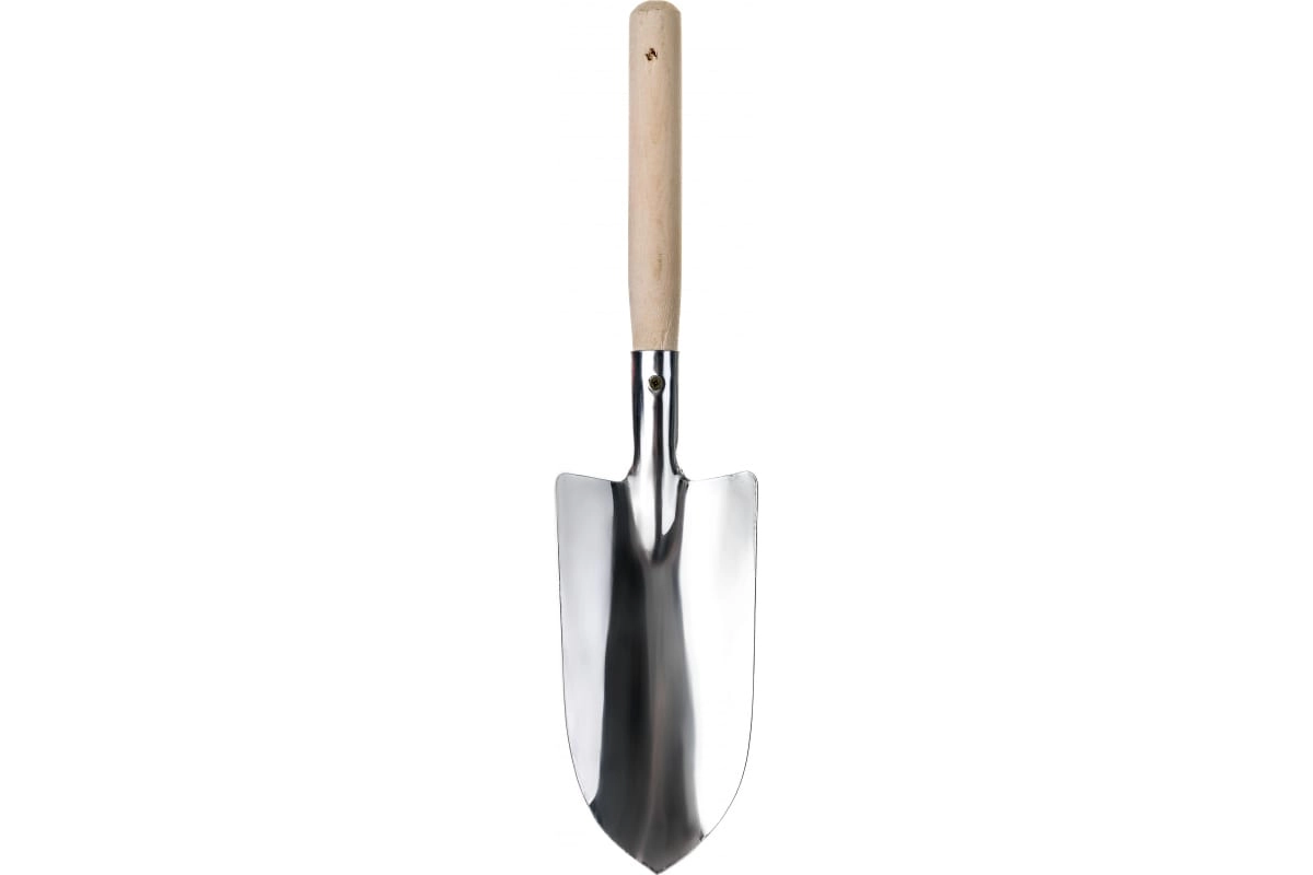 Большой посадочный совок предназначен для работы на садовых участках. Материал корпуса выполнен из нержавеющей стали, поэтому инструмент отличается превосходной прочностью, высокой ударной вязкостью и долговечностью. Деревянный черенок надежно скреплен с рабочей частью с помощью стального воротника.